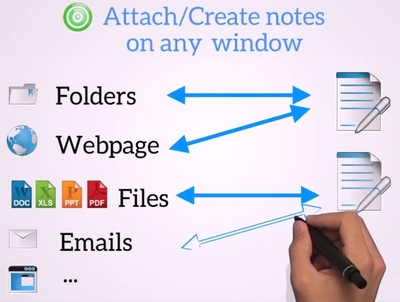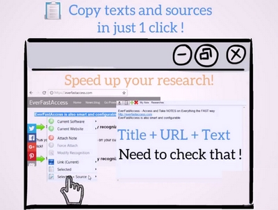 EverFastAccess vous offre des moyens innovants d'attacher vos notes automatiquement à vos logiciels, sites web, fichiers ou tout simplement n'importe quelle fenêtre. Vous pouvez pas exemple prendre une notes sur l'un de vos fichiers, et vous serez notifié et pourrez y accéder automatiquement lorsque vous ré-accéderez le fichier.